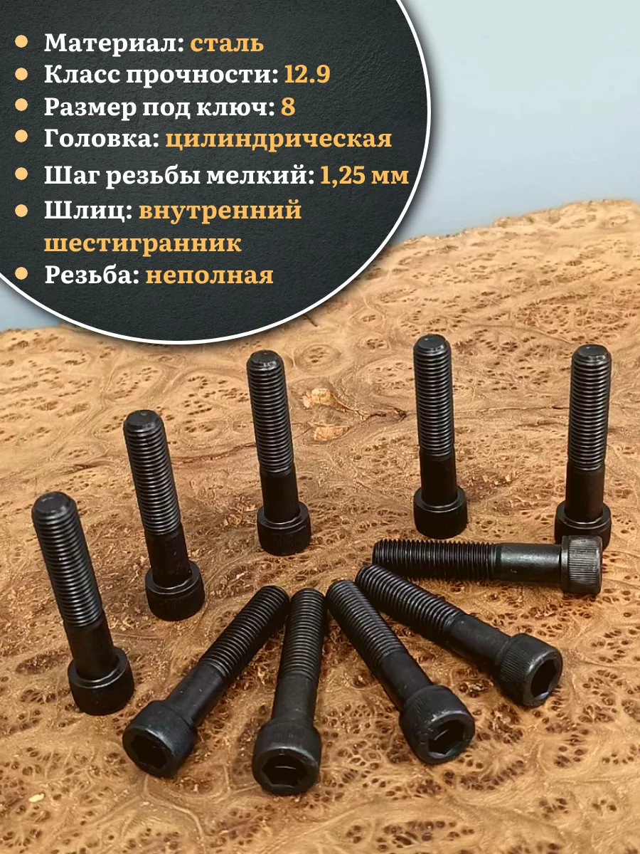 Винт мелкая резьба чёрный к.п.12.9 10х60х1,25 DIN912, 10 шт.