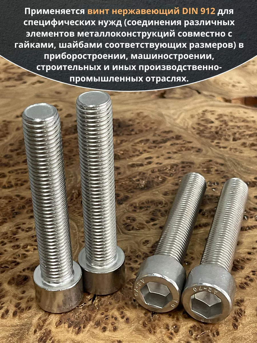 Винт DIN 912 представляет собой металлический стержень с метрической резьбой и головкой цилиндрической формы. Изготовляется из разных материалов, в зависимости от области его применения: сталь 8.8,10.9 или 12,9, сталь с оцинкованным покрытием, нержавеющая сталь А2- А5, латунь, пластик. Прочность на разрыв стали подобного класса достаточно высока, поэтому DIN 912 применяют в конструкциях, которые подвержены серьезным нагрузкам. Применяется винт DIN 912 для специфических нужд (соединения различных элементов металлоконструкций совместно с гайками, шайбами соответствующих размеров) в приборостроении, машиностроении, строительных и иных производственно-промышленных отраслях.