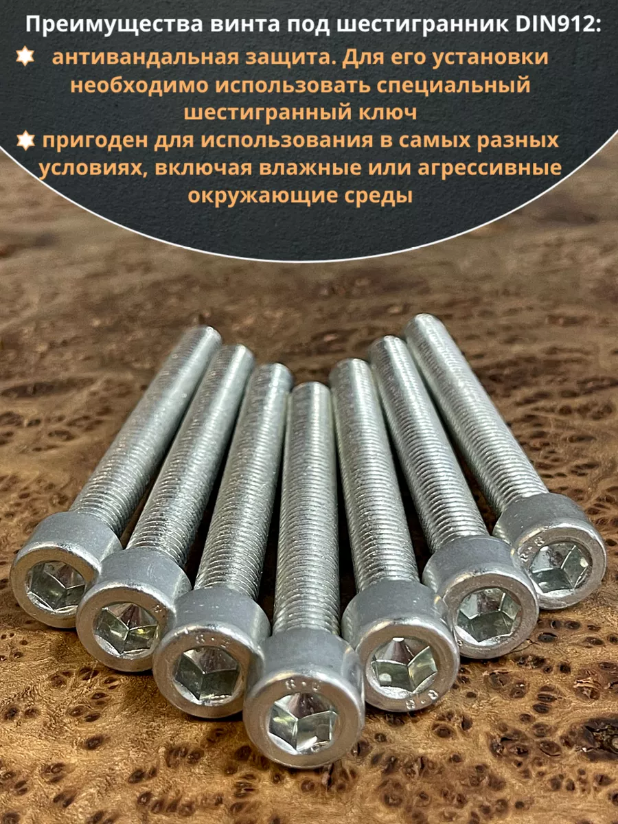 Винт DIN 912 представляет собой металлический стержень с метрической резьбой и головкой цилиндрической формы. Изготовляется из разных материалов, в зависимости от области его применения: сталь 8.8,10.9 или 12,9, сталь с оцинкованным покрытием, нержавеющая сталь А2- А5, латунь, пластик. Прочность на разрыв стали подобного класса достаточно высока, поэтому DIN 912 применяют в конструкциях, которые подвержены серьезным нагрузкам. Применяется винт DIN 912 для специфических нужд (соединения различных элементов металлоконструкций совместно с гайками, шайбами соответствующих размеров) в приборостроении, машиностроении, строительных и иных производственно-промышленных отраслях.