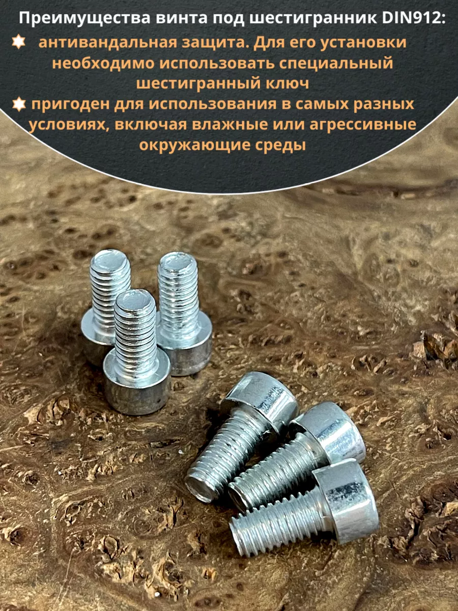 Винт DIN 912 представляет собой металлический стержень с метрической резьбой и головкой цилиндрической формы. Изготовляется из разных материалов, в зависимости от области его применения: сталь 8.8,10.9 или 12,9, сталь с оцинкованным покрытием, нержавеющая сталь А2- А5, латунь, пластик. Прочность на разрыв стали подобного класса достаточно высока, поэтому DIN 912 применяют в конструкциях, которые подвержены серьезным нагрузкам. Применяется винт DIN 912 для специфических нужд (соединения различных элементов металлоконструкций совместно с гайками, шайбами соответствующих размеров) в приборостроении, машиностроении, строительных и иных производственно-промышленных отраслях.