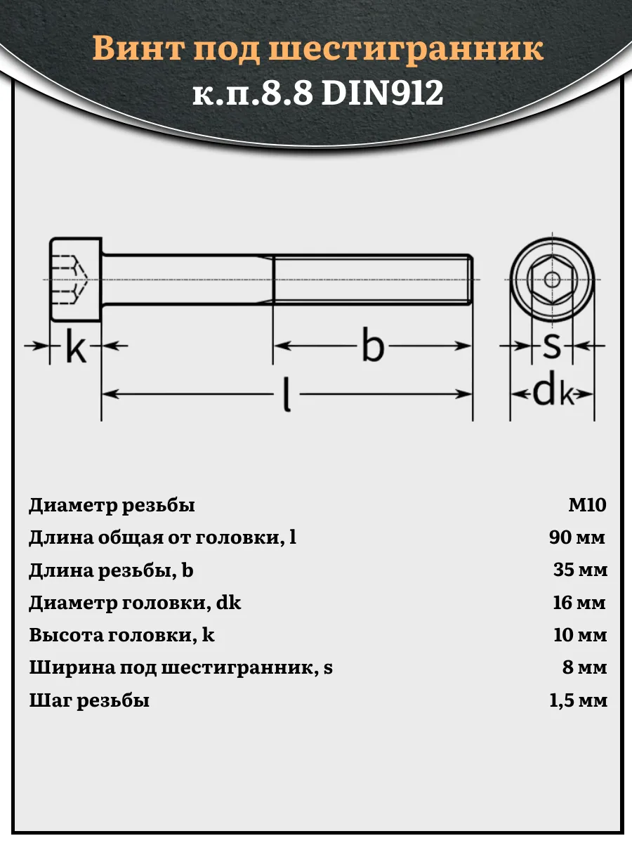 Винт под шестигранник НР 10х90 мм ОЦ к.п.8.8 DIN912, 10 шт.