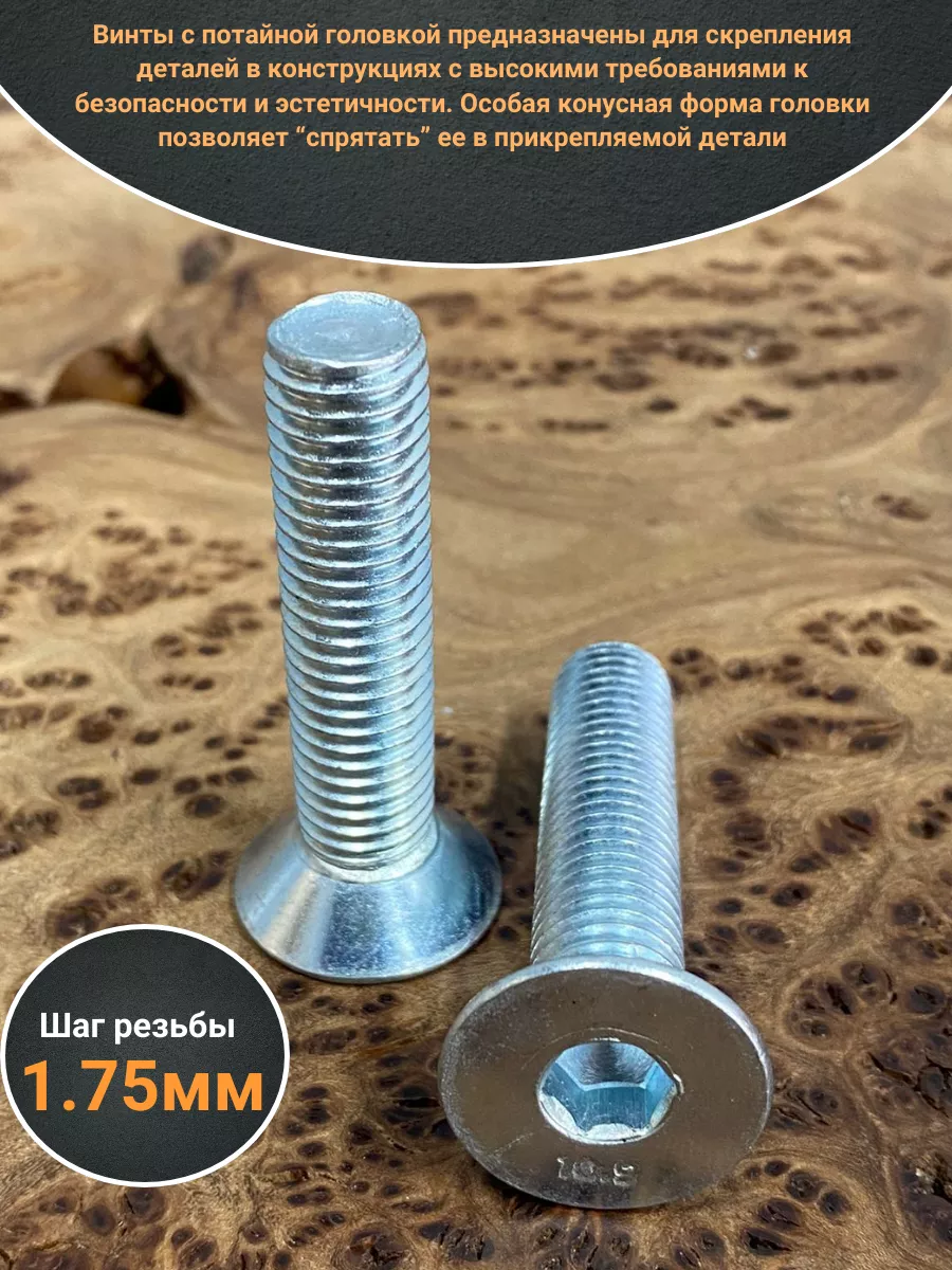 Винты с потайной головкой предназначены для скрепления деталей в конструкциях с высокими требованиями к безопасности и эстетичности. Особая конусная форма головки позволяет “спрятать” ее в прикрепляемой детали. При этом поверхность головки находится в одной плоскости с поверхностью детали. Крепёж с такими свойствами высоко востребован в машино-, автомобилестроении, при сборке бытовой техники, в приборостроении. Конструкция винта DIN 7991 включает стержень с метрической резьбой, потайную головку и шестигранное углубление под ключ для передачи крепежному изделию крутящего момента. Шестигранный внутренний диаметр углубления дает возможность подавать гораздо большее усилие при установке в контакте с ключом или битой. Винты DIN 7991 могут изготавливаться из углеродистых и легированных сталей