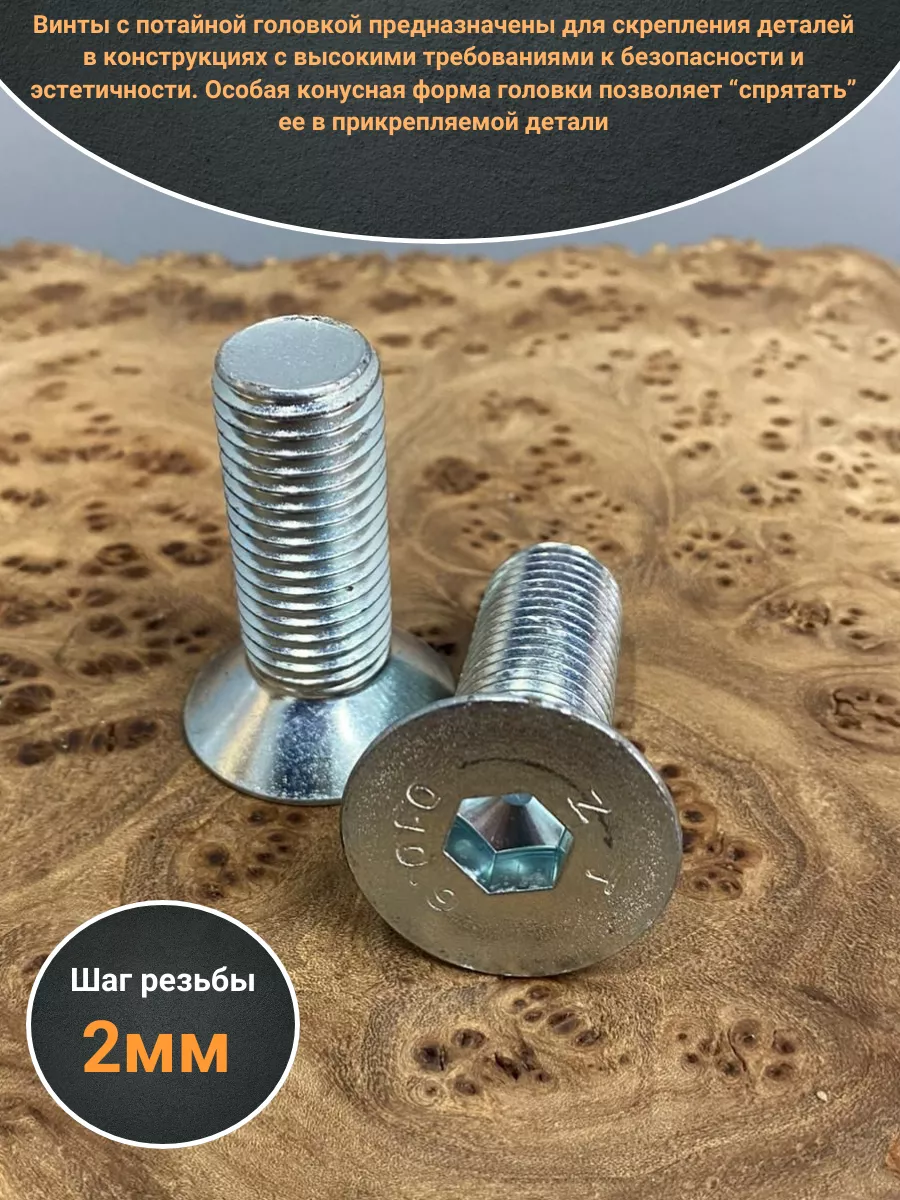 Винты с потайной головкой предназначены для скрепления деталей в конструкциях с высокими требованиями к безопасности и эстетичности. Особая конусная форма головки позволяет “спрятать” ее в прикрепляемой детали. При этом поверхность головки находится в одной плоскости с поверхностью детали. Крепёж с такими свойствами высоко востребован в машино-, автомобилестроении, при сборке бытовой техники, в приборостроении. Конструкция винта DIN 7991 включает стержень с метрической резьбой, потайную головку и шестигранное углубление под ключ для передачи крепежному изделию крутящего момента. Шестигранный внутренний диаметр углубления дает возможность подавать гораздо большее усилие при установке в контакте с ключом или битой. Винты DIN 7991 могут изготавливаться из углеродистых и легированных сталей