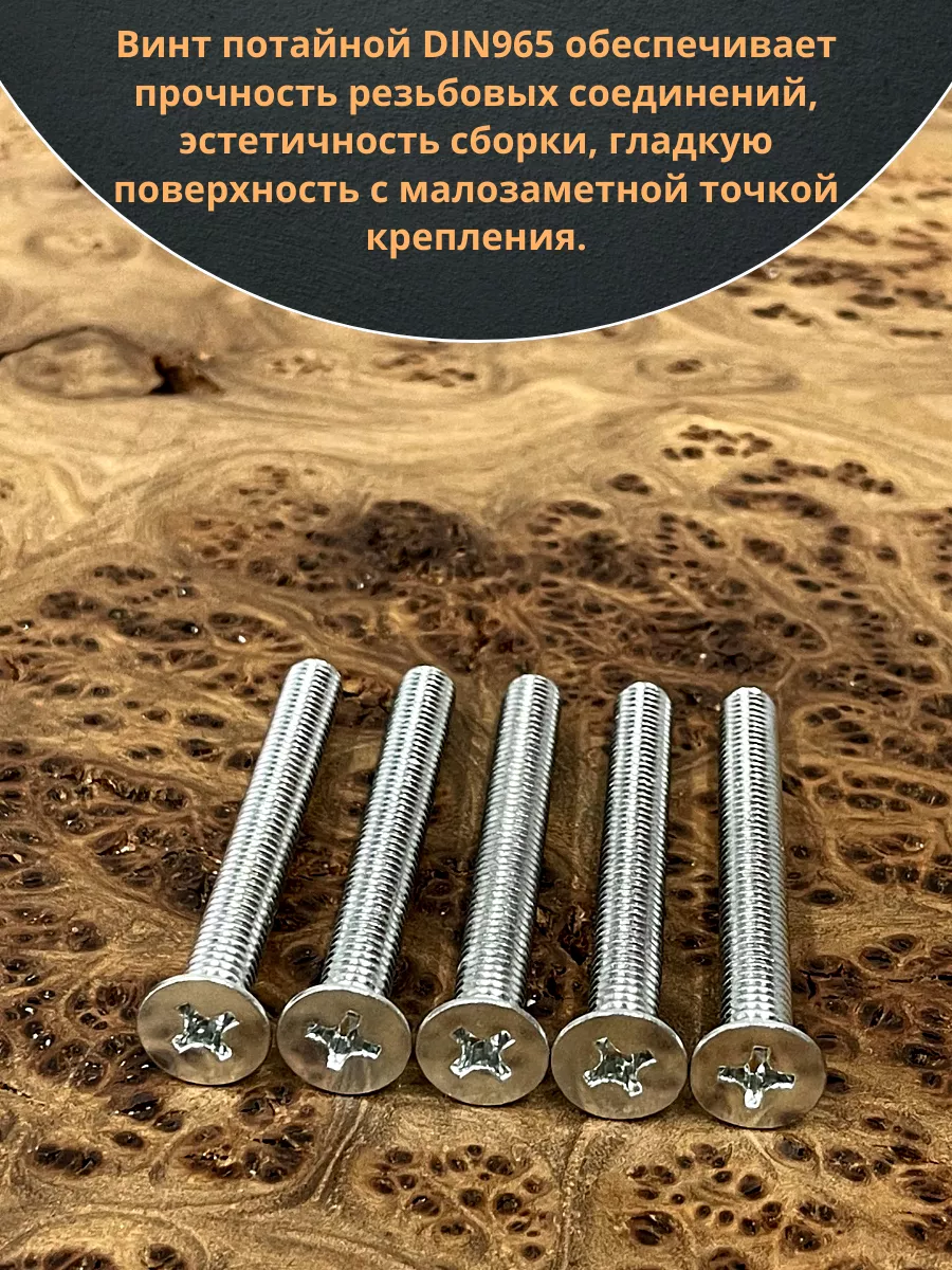 Винт с потайной головкой состоит из головки и стержня с полной резьбой, нарезанной по всей длине шпильки, не имеющего заострения на конце, предназначен для соединения деталей. Монтаж может быть сквозным или глухим. Головка утапливается в материал или конструкцию, не оставаясь на поверхности. Винты DIN 965 используются в строительстве, машиностроении, промышленных и производственных отраслях совместно с шайбами, гайками соответствующих размеров.