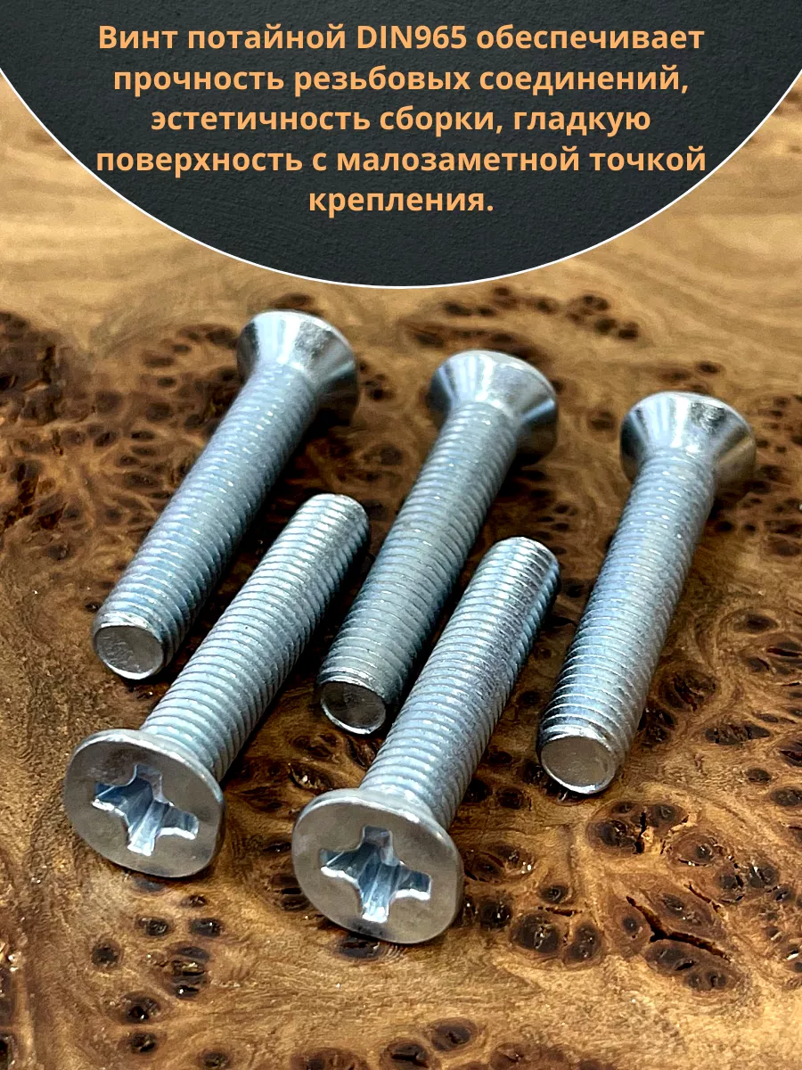 Винт с потайной головкой состоит из головки и стержня с полной резьбой, нарезанной по всей длине шпильки, не имеющего заострения на конце, предназначен для соединения деталей. Монтаж может быть сквозным или глухим. Головка утапливается в материал или конструкцию, не оставаясь на поверхности. Винты DIN 965 используются в строительстве, машиностроении, промышленных и производственных отраслях совместно с шайбами, гайками соответствующих размеров.