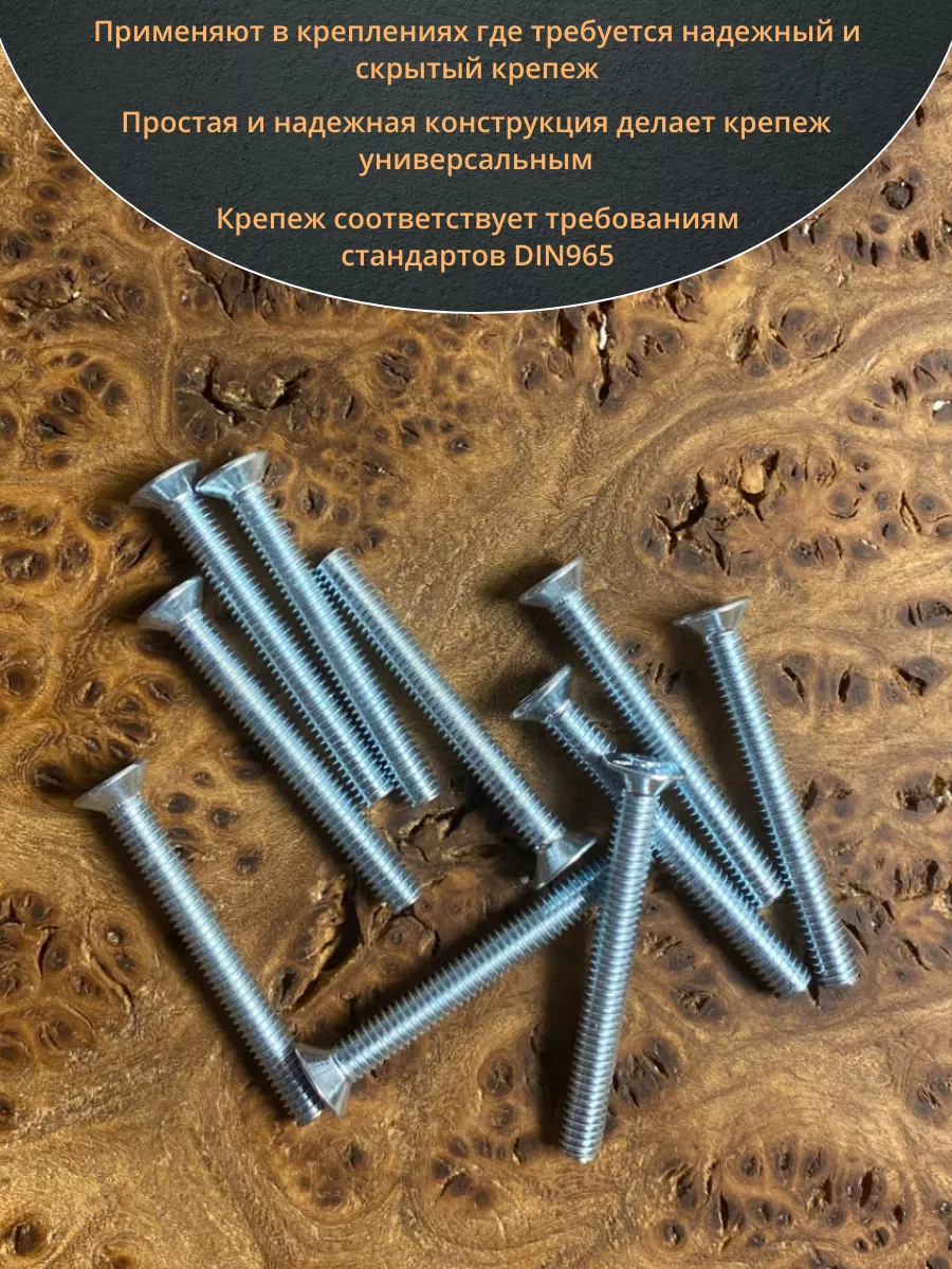 Винт с потайной головкой состоит из головки и стержня с полной резьбой, нарезанной по всей длине шпильки, не имеющего заострения на конце, предназначен для соединения деталей. Монтаж может быть сквозным или глухим. Головка утапливается в материал или конструкцию, не оставаясь на поверхности. Винты DIN 965 используются в строительстве, машиностроении, промышленных и производственных отраслях совместно с шайбами, гайками соответствующих размеров.