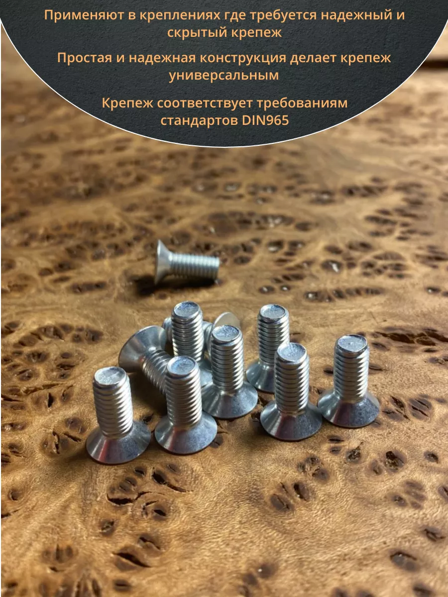 Винт с потайной головкой состоит из головки и стержня с полной резьбой, нарезанной по всей длине шпильки, не имеющего заострения на конце, предназначен для соединения деталей. Монтаж может быть сквозным или глухим. Головка утапливается в материал или конструкцию, не оставаясь на поверхности. Винты DIN 965 используются в строительстве, машиностроении, промышленных и производственных отраслях совместно с шайбами, гайками соответствующих размеров.