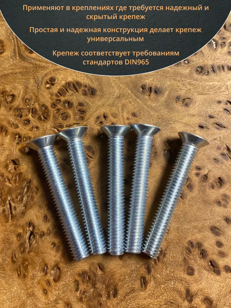 Винт с потайной головкой состоит из головки и стержня с полной резьбой, нарезанной по всей длине шпильки, не имеющего заострения на конце, предназначен для соединения деталей. Монтаж может быть сквозным или глухим. Головка утапливается в материал или конструкцию, не оставаясь на поверхности. Винты DIN 965 используются в строительстве, машиностроении, промышленных и производственных отраслях совместно с шайбами, гайками соответствующих размеров.