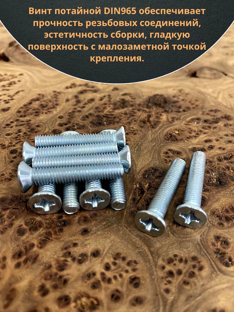 Винт с потайной головкой состоит из головки и стержня с полной резьбой, нарезанной по всей длине шпильки, не имеющего заострения на конце, предназначен для соединения деталей. Монтаж может быть сквозным или глухим. Головка утапливается в материал или конструкцию, не оставаясь на поверхности. Винты DIN 965 используются в строительстве, машиностроении, промышленных и производственных отраслях совместно с шайбами, гайками соответствующих размеров.