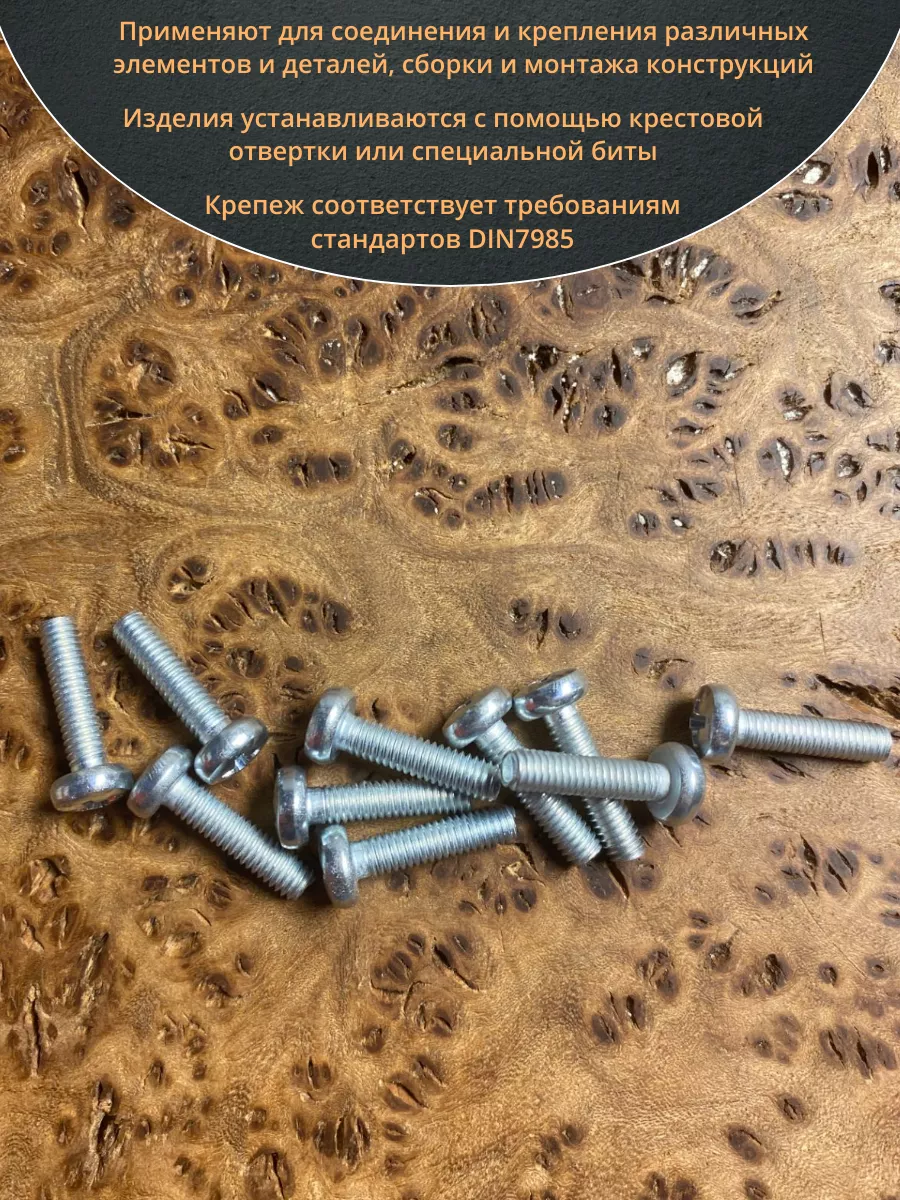 Винт DIN 7985 представляет собой крепежный элемент с полукруглой головкой и шлицем: Philips, Pozi или Torx., подходящим под отвертки и биты. Предназначены для соединения металлических и неметаллических материалов. Винт DIN 7985 используется в производственных, промышленных и строительных областях совместно с шайбами, гайками, втулками и прочими отверстиями с соответствующим размером резьбы, при различных соединениях и креплениях элементов. Производятся из углеродистой стали, нержавеющей стали А2 и А4, латуни, алюминия. Винты, произведенные из углеродистой стали, как правило оцинкованы.