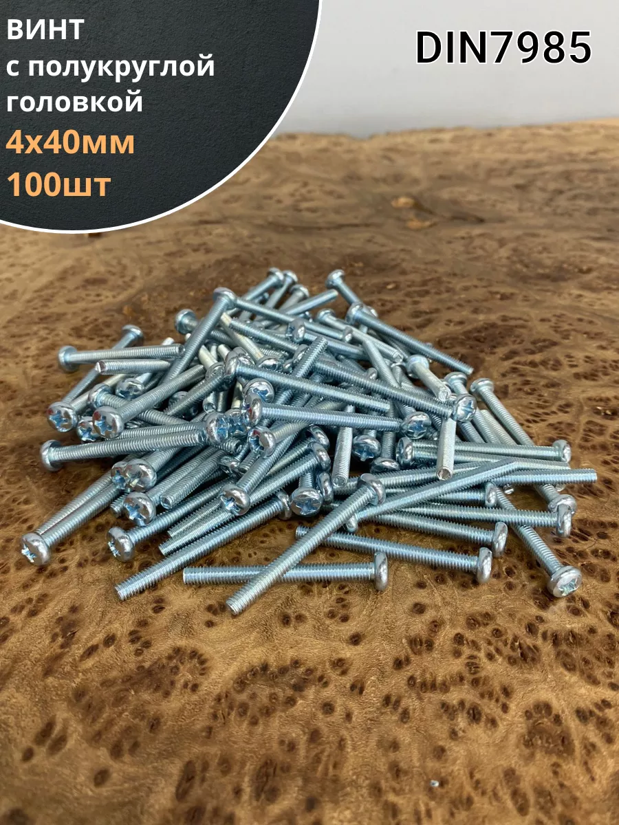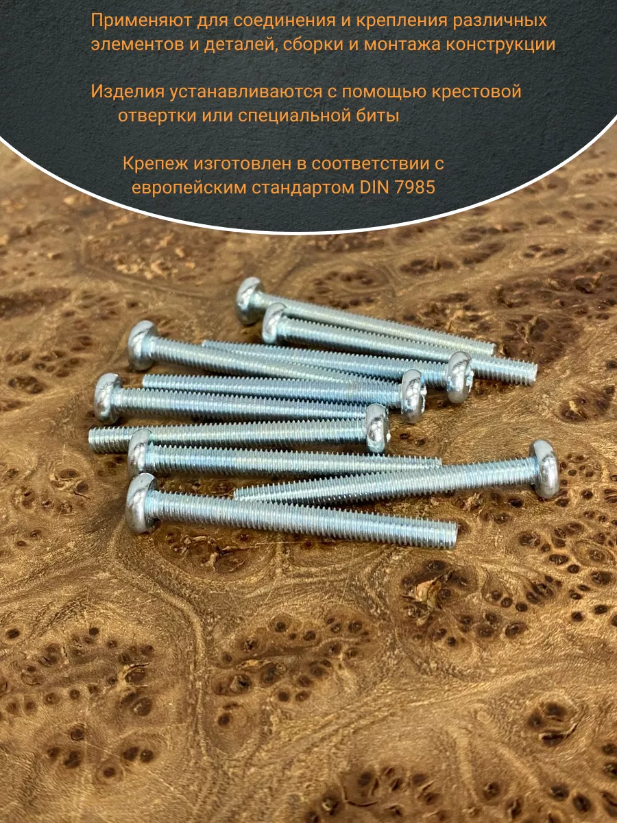 Винт DIN 7985 представляет собой крепежный элемент с полукруглой головкой и шлицем: Philips, Pozi или Torx., подходящим под отвертки и биты. Предназначены для соединения металлических и неметаллических материалов. Винт DIN 7985 используется в производственных, промышленных и строительных областях совместно с шайбами, гайками, втулками и прочими отверстиями с соответствующим размером резьбы, при различных соединениях и креплениях элементов. Производятся из углеродистой стали, нержавеющей стали А2 и А4, латуни, алюминия. Винты, произведенные из углеродистой стали, как правило оцинкованы.