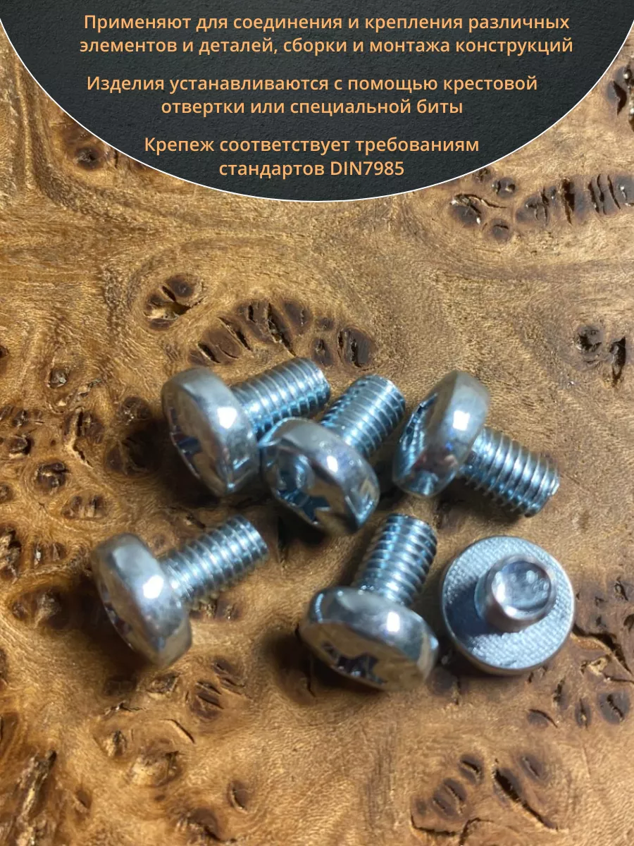 Винт DIN 7985 представляет собой крепежный элемент с полукруглой головкой и шлицем: Philips, Pozi или Torx., подходящим под отвертки и биты. Предназначены для соединения металлических и неметаллических материалов. Винт DIN 7985 используется в производственных, промышленных и строительных областях совместно с шайбами, гайками, втулками и прочими отверстиями с соответствующим размером резьбы, при различных соединениях и креплениях элементов. Производятся из углеродистой стали, нержавеющей стали А2 и А4, латуни, алюминия. Винты, произведенные из углеродистой стали, как правило оцинкованы.