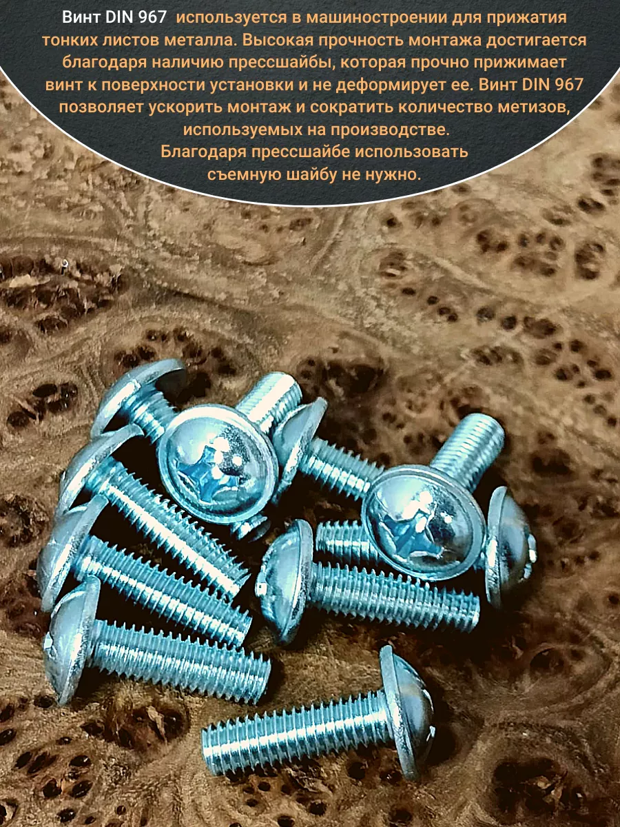 Винт мебельный DIN 967 — это универсальное крепежное изделие в виде стержня с наружной резьбой, выполненной по всей длиннее. Головка крепежа в виде полусферы с широкими полями, на головки имеются пазы под крестовую отвертку. При проведении монтажа можно использовать как PZ, так и SL отвертки или насадки, что делает крепеж универсальным.