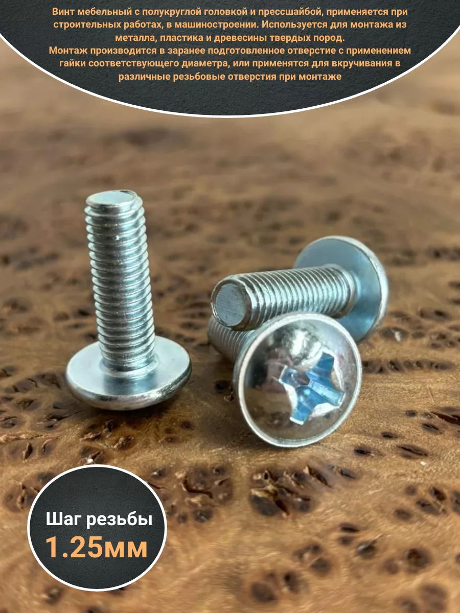 Винт мебельный с полукруглой головкой и прессшайбой, применяется при строительных работах, в машиностроении. Используется для монтажа из металла, пластика и древесины твердых пород. Монтаж производится в заранее подготовленное отверстие с применением гайки соответствующего диаметра, или применятся для вкручивания в различные резьбовые отверстия при монтаже. Винт мебельный DIN 967 — это универсальное крепежное изделие в виде стержня с наружной резьбой, выполненной по всей длинне. Головка крепежа в виде полусферы с широкими полями, на головке имеются пазы под крестовую отвертку. При проведении монтажа можно использовать как PZ, так и SL отвертки или насадки, что делает крепеж универсальным.