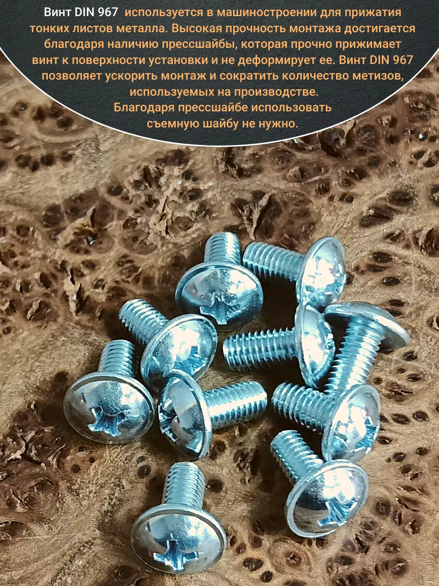 Винт мебельный с полукруглой головкой и прессшайбой, применяется при строительных работах, в машиностроении. Используется для монтажа из металла, пластика и древесины твердых пород. Монтаж производится в заранее подготовленное отверстие с применением гайки соответствующего диаметра, или применятся для вкручивания в различные резьбовые отверстия при монтаже. Винт мебельный DIN 967 — это универсальное крепежное изделие в виде стержня с наружной резьбой, выполненной по всей длинне. Головка крепежа в виде полусферы с широкими полями, на головке имеются пазы под крестовую отвертку. При проведении монтажа можно использовать как PZ, так и SL отвертки или насадки, что делает крепеж универсальным.