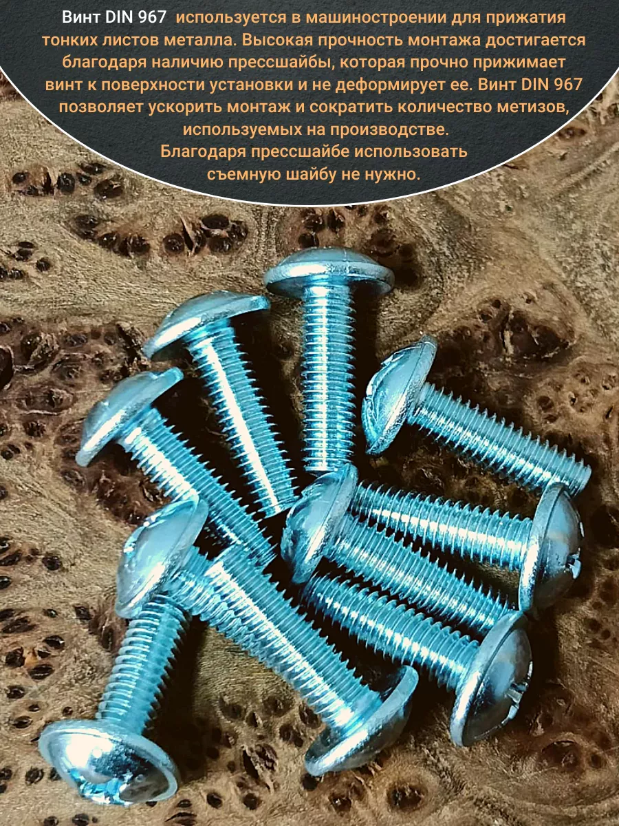 Винт мебельный с полукруглой головкой и прессшайбой, применяется при строительных работах, в машиностроении. Используется для монтажа из металла, пластика и древесины твердых пород. Монтаж производится в заранее подготовленное отверстие с применением гайки соответствующего диаметра, или применятся для вкручивания в различные резьбовые отверстия при монтаже. Винт мебельный DIN 967 — это универсальное крепежное изделие в виде стержня с наружной резьбой, выполненной по всей длинне. Головка крепежа в виде полусферы с широкими полями, на головке имеются пазы под крестовую отвертку. При проведении монтажа можно использовать как PZ, так и SL отвертки или насадки, что делает крепеж универсальным.