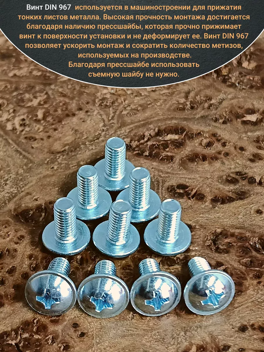 Винт мебельный с полукруглой головкой и прессшайбой, применяется при строительных работах, в машиностроении. Используется для монтажа из металла, пластика и древесины твердых пород. Монтаж производится в заранее подготовленное отверстие с применением гайки соответствующего диаметра, или применятся для вкручивания в различные резьбовые отверстия при монтаже. Винт мебельный DIN 967 — это универсальное крепежное изделие в виде стержня с наружной резьбой, выполненной по всей длинне. Головка крепежа в виде полусферы с широкими полями, на головке имеются пазы под крестовую отвертку. При проведении монтажа можно использовать как PZ, так и SL отвертки или насадки, что делает крепеж универсальным.