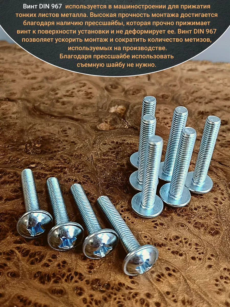 Винт мебельный DIN 967 — это универсальное крепежное изделие в виде стержня с наружной резьбой, выполненной по всей длиннее. Головка крепежа в виде полусферы с широкими полями, на головки имеются пазы под крестовую отвертку. При проведении монтажа можно использовать как PZ, так и SL отвертки или насадки, что делает крепеж универсальным.