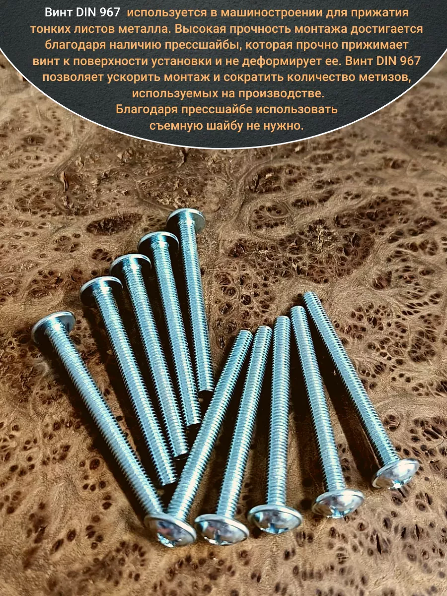 Винт мебельный с полукруглой головкой и прессшайбой, применяется при строительных работах, в машиностроении. Используется для монтажа из металла, пластика и древесины твердых пород. Монтаж производится в заранее подготовленное отверстие с применением гайки соответствующего диаметра, или применятся для вкручивания в различные резьбовые отверстия при монтаже. Винт мебельный DIN 967 — это универсальное крепежное изделие в виде стержня с наружной резьбой, выполненной по всей длинне. Головка крепежа в виде полусферы с широкими полями, на головке имеются пазы под крестовую отвертку. При проведении монтажа можно использовать как PZ, так и SL отвертки или насадки, что делает крепеж универсальным.