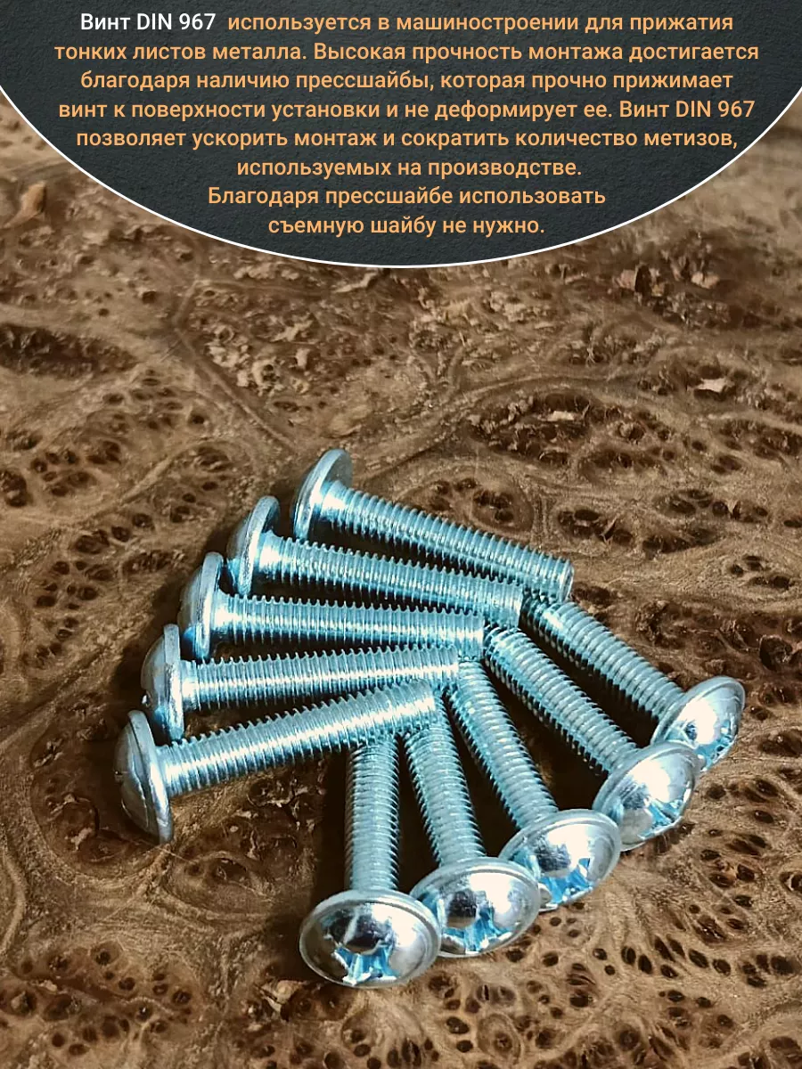 Винт мебельный с полукруглой головкой и прессшайбой, применяется при строительных работах, в машиностроении. Используется для монтажа из металла, пластика и древесины твердых пород. Монтаж производится в заранее подготовленное отверстие с применением гайки соответствующего диаметра, или применятся для вкручивания в различные резьбовые отверстия при монтаже. Винт мебельный DIN 967 — это универсальное крепежное изделие в виде стержня с наружной резьбой, выполненной по всей длинне. Головка крепежа в виде полусферы с широкими полями, на головке имеются пазы под крестовую отвертку. При проведении монтажа можно использовать как PZ, так и SL отвертки или насадки, что делает крепеж универсальным.