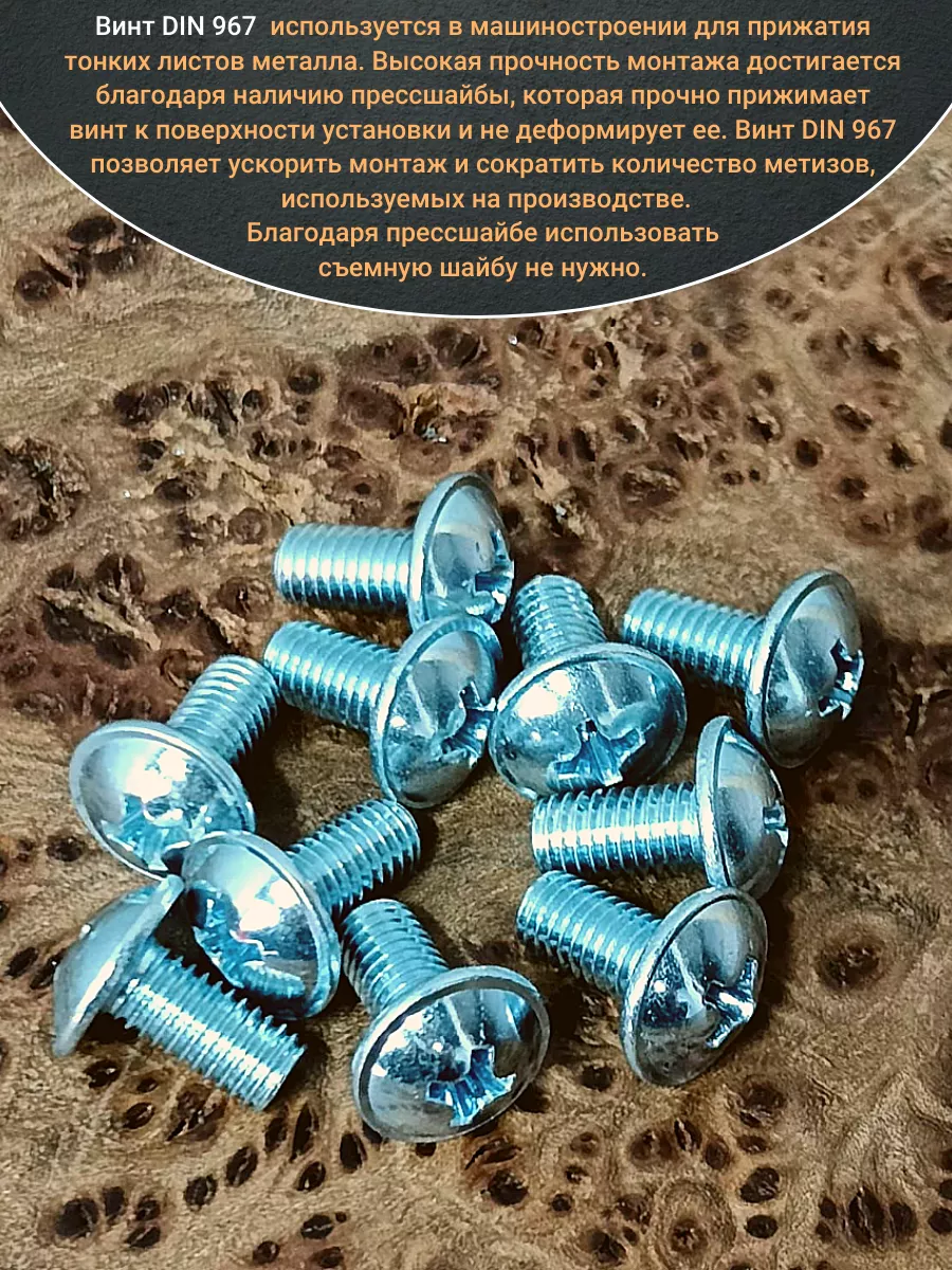 Винт мебельный с полукруглой головкой и прессшайбой, применяется при строительных работах, в машиностроении. Используется для монтажа из металла, пластика и древесины твердых пород. Монтаж производится в заранее подготовленное отверстие с применением гайки соответствующего диаметра, или применятся для вкручивания в различные резьбовые отверстия при монтаже. Винт мебельный DIN 967 — это универсальное крепежное изделие в виде стержня с наружной резьбой, выполненной по всей длинне. Головка крепежа в виде полусферы с широкими полями, на головке имеются пазы под крестовую отвертку. При проведении монтажа можно использовать как PZ, так и SL отвертки или насадки, что делает крепеж универсальным.