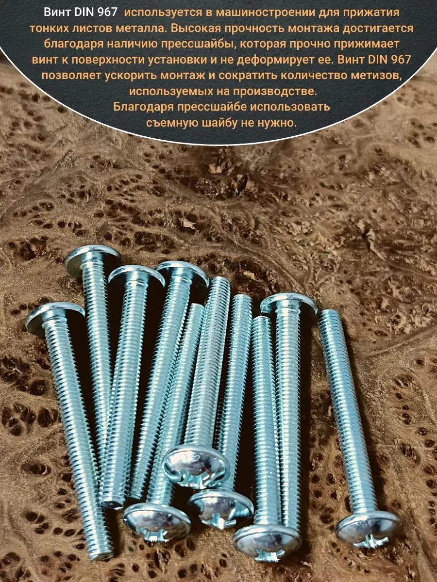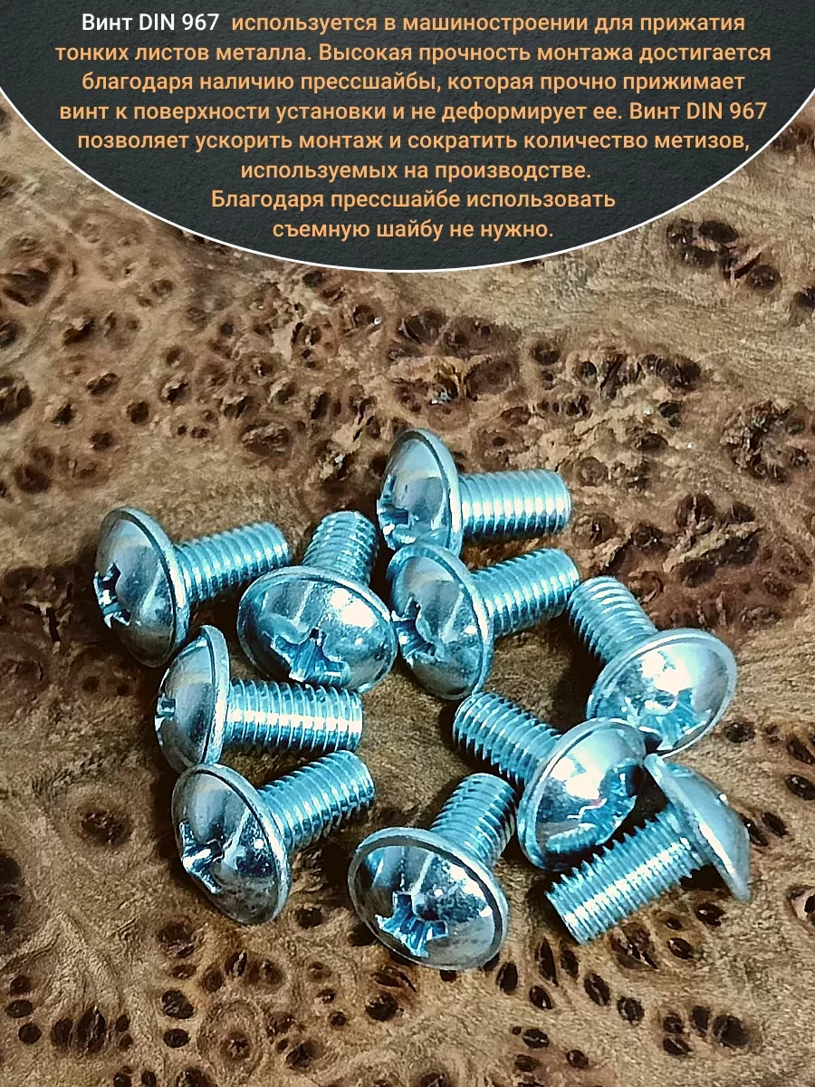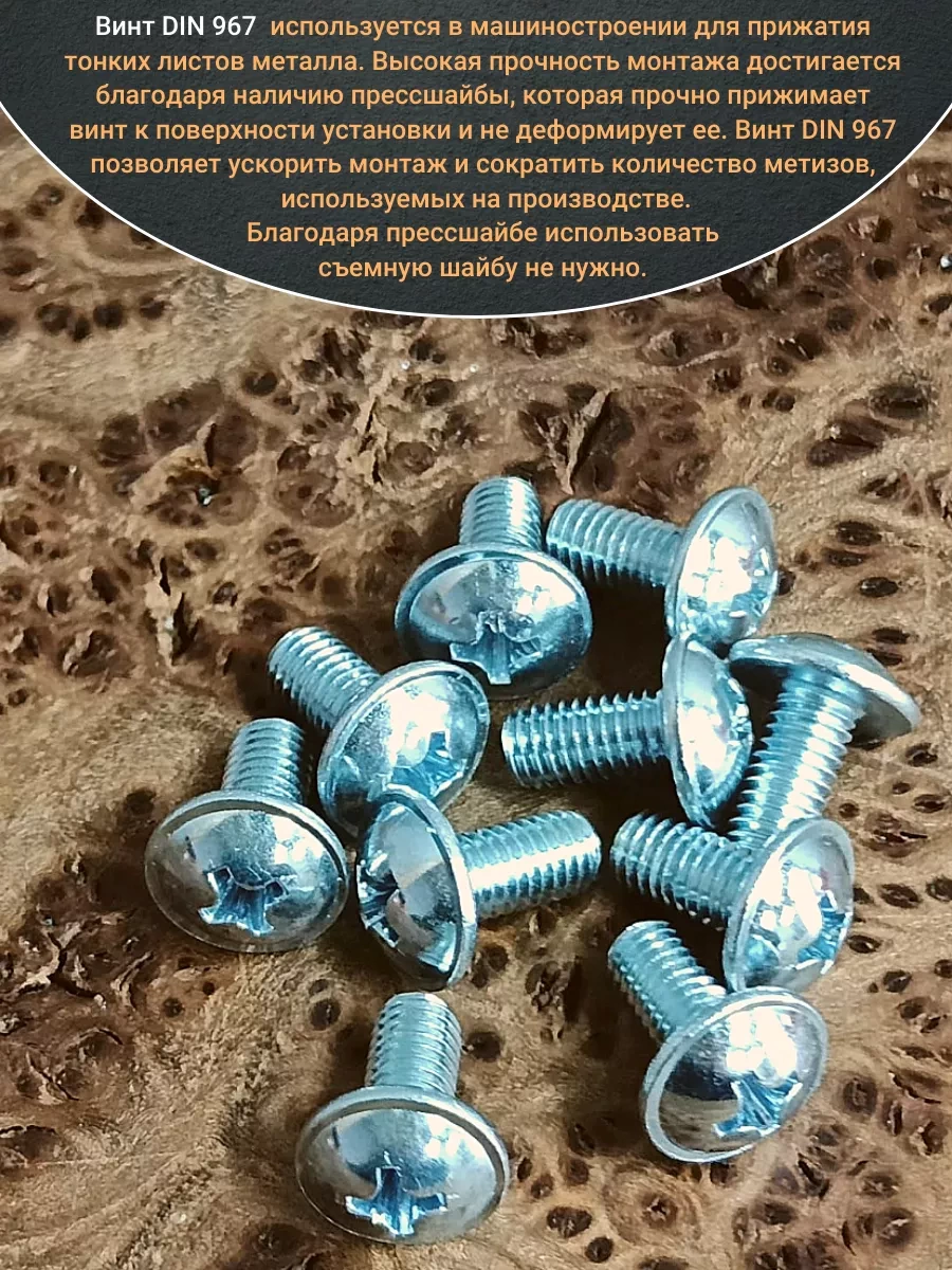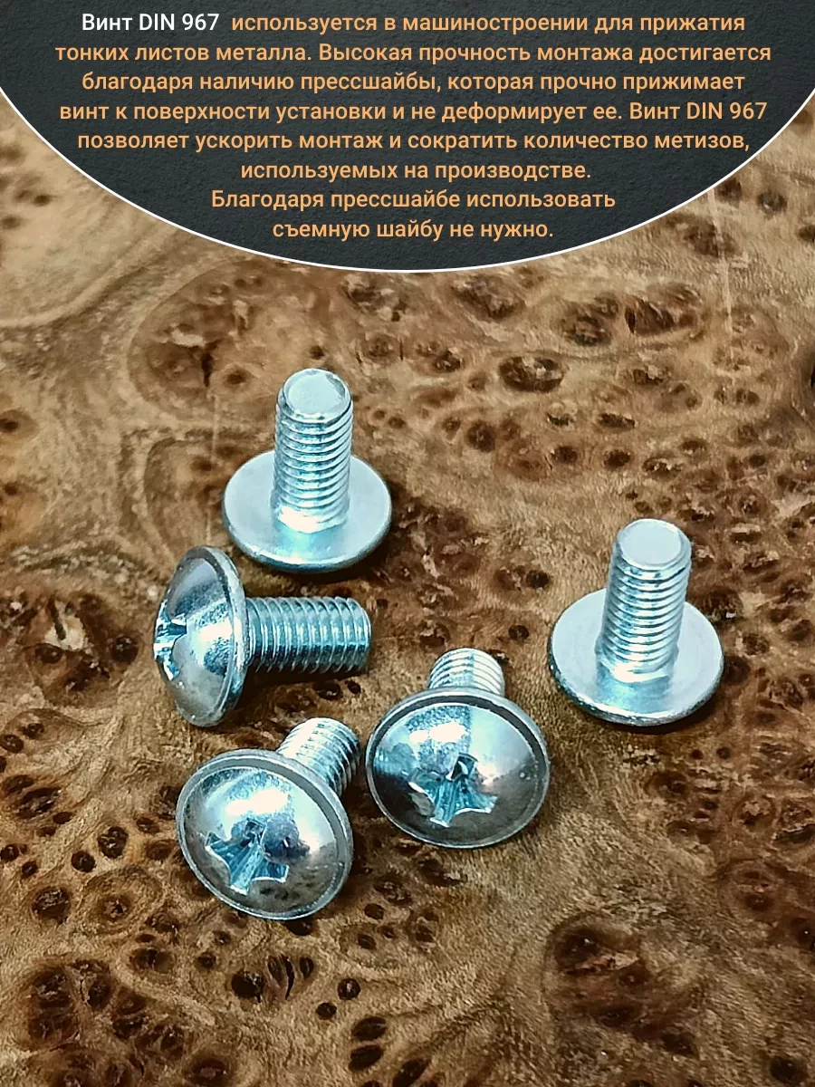 Винт мебельный DIN 967 — это универсальное крепежное изделие в виде стержня с наружной резьбой, выполненной по всей длиннее. Головка крепежа в виде полусферы с широкими полями, на головки имеются пазы под крестовую отвертку. При проведении монтажа можно использовать как PZ, так и SL отвертки или насадки, что делает крепеж универсальным.