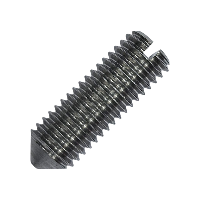 Установочный острый винт DIN 553 (ISO 7434) — это полнорезьбовой винт без головки с коническим концом и шлицем на торце под плоскую отвёртку. Он предназначен для скрепления элементов конструкции и их надёжной фиксации друг относительно друга. Винт обладает высокой вращающей и осевой удерживающей способностью.