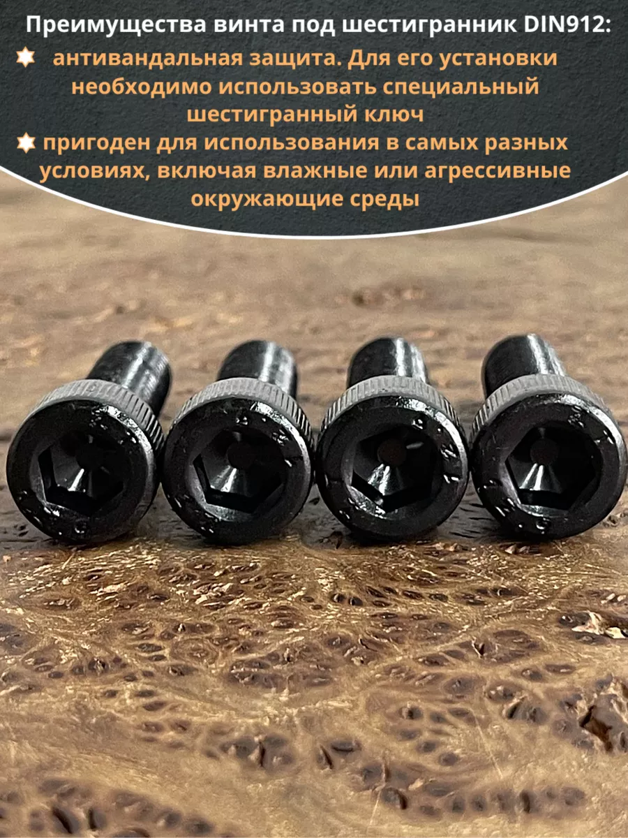 Винт имеет высокую цилиндрическую головку, предназначен для установки его с углублением в отверстие. Закручивается винт при помощи ключа-шестигранника. Высокопрочный винт DIN 912 обеспечивает надежное скрепление узлов и деталей в монтажных и других видах работ. Он имеет головку цилиндрической формы с углублением под соответствующий шестигранный ключ.