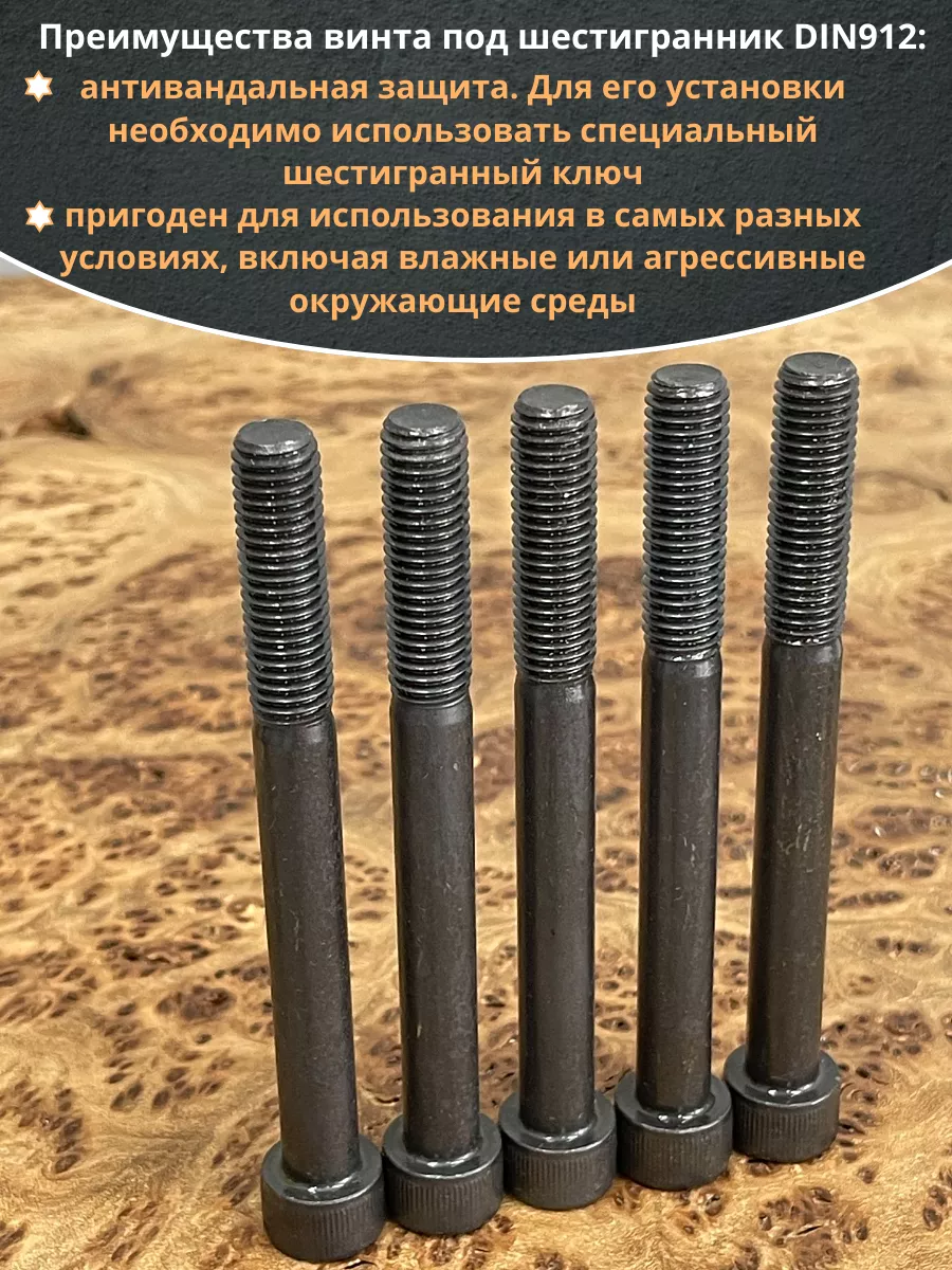 Винт имеет высокую цилиндрическую головку, предназначен для установки его с углублением в отверстие. Закручивается винт при помощи ключа-шестигранника. Высокопрочный винт DIN 912 обеспечивает надежное скрепление узлов и деталей в монтажных и других видах работ. Он имеет головку цилиндрической формы с углублением под соответствующий шестигранный ключ.