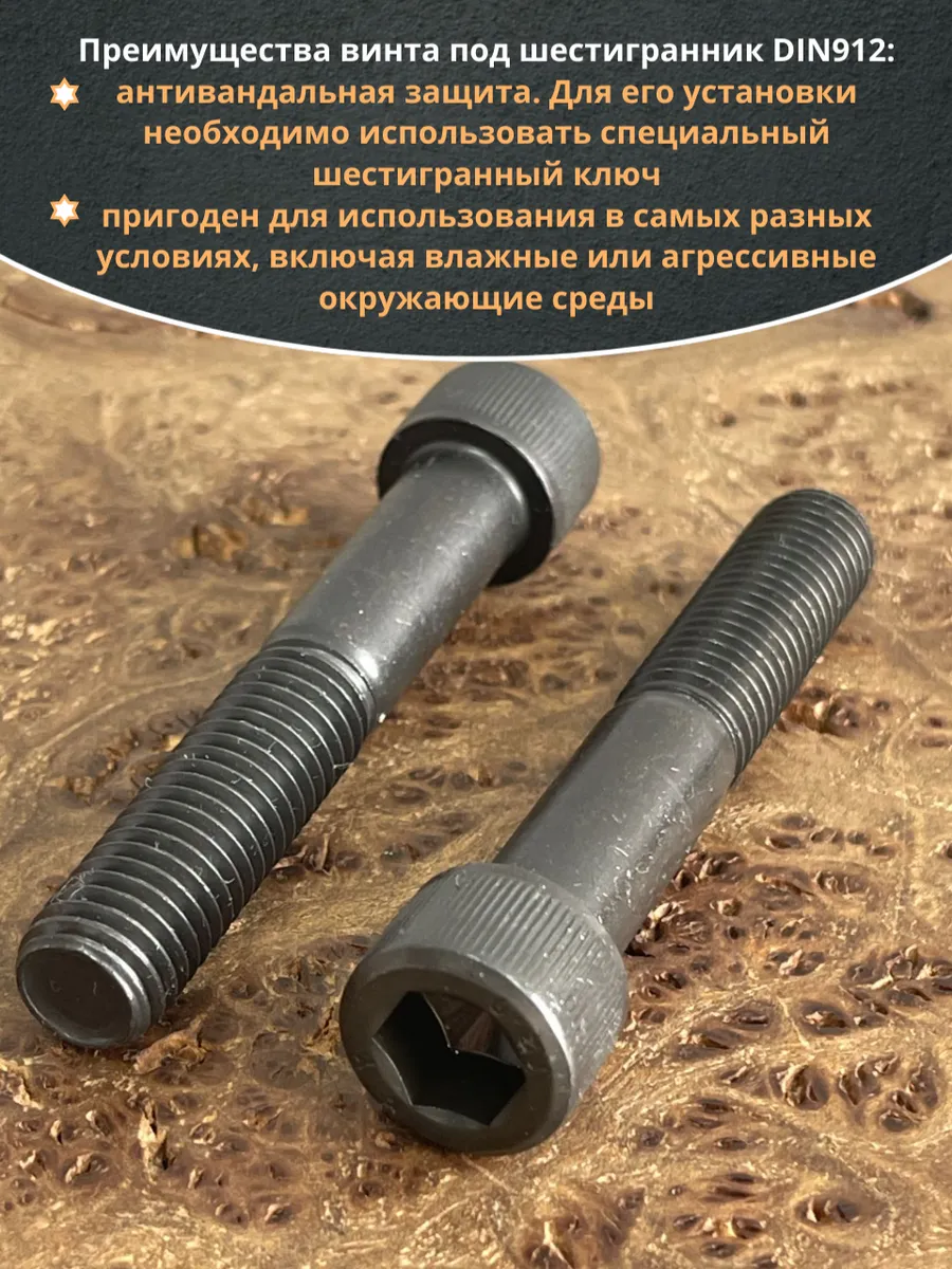 Винт имеет высокую цилиндрическую головку, предназначен для установки его с углублением в отверстие. Закручивается винт при помощи ключа-шестигранника. Высокопрочный винт DIN 912 обеспечивает надежное скрепление узлов и деталей в монтажных и других видах работ. Он имеет головку цилиндрической формы с углублением под соответствующий шестигранный ключ.