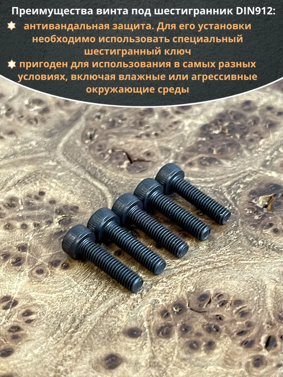 Винт имеет высокую цилиндрическую головку, предназначен для установки его с углублением в отверстие. Закручивается винт при помощи ключа-шестигранника. Высокопрочный винт DIN 912 обеспечивает надежное скрепление узлов и деталей в монтажных и других видах работ. Он имеет головку цилиндрической формы с углублением под соответствующий шестигранный ключ.