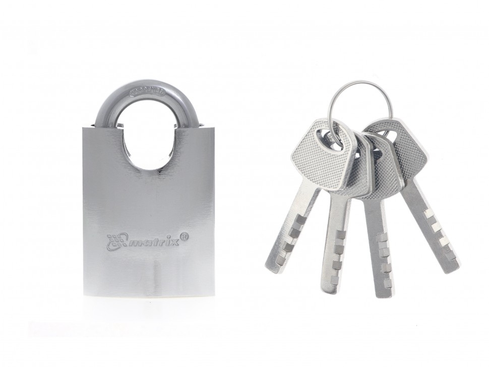 Навесной замок Matrix 91804 с защищенной дужкой 50 мм используется для запирания дверей, ящиков и т.д. Он обеспечивает защиту помещений и собственности от проникновения и кражи. Монтаж замка происходит максимально просто с фиксацией на проушины и не требует специальных инструментов. Дужка спрятана в корпусе, поэтому замок сложно взломать.Преимущества Высокую прочность и взломостойкость замка обеспечивают секретный механизм, корпус и дужка из стали. Замок можно вешать на улице, т.к. хромированные корпус и дужка не подвержены образованию коррозии. 4-х ключей в комплекте хватит на использование несколькими людьми, а также они обеспечивают запас на случай потери.
